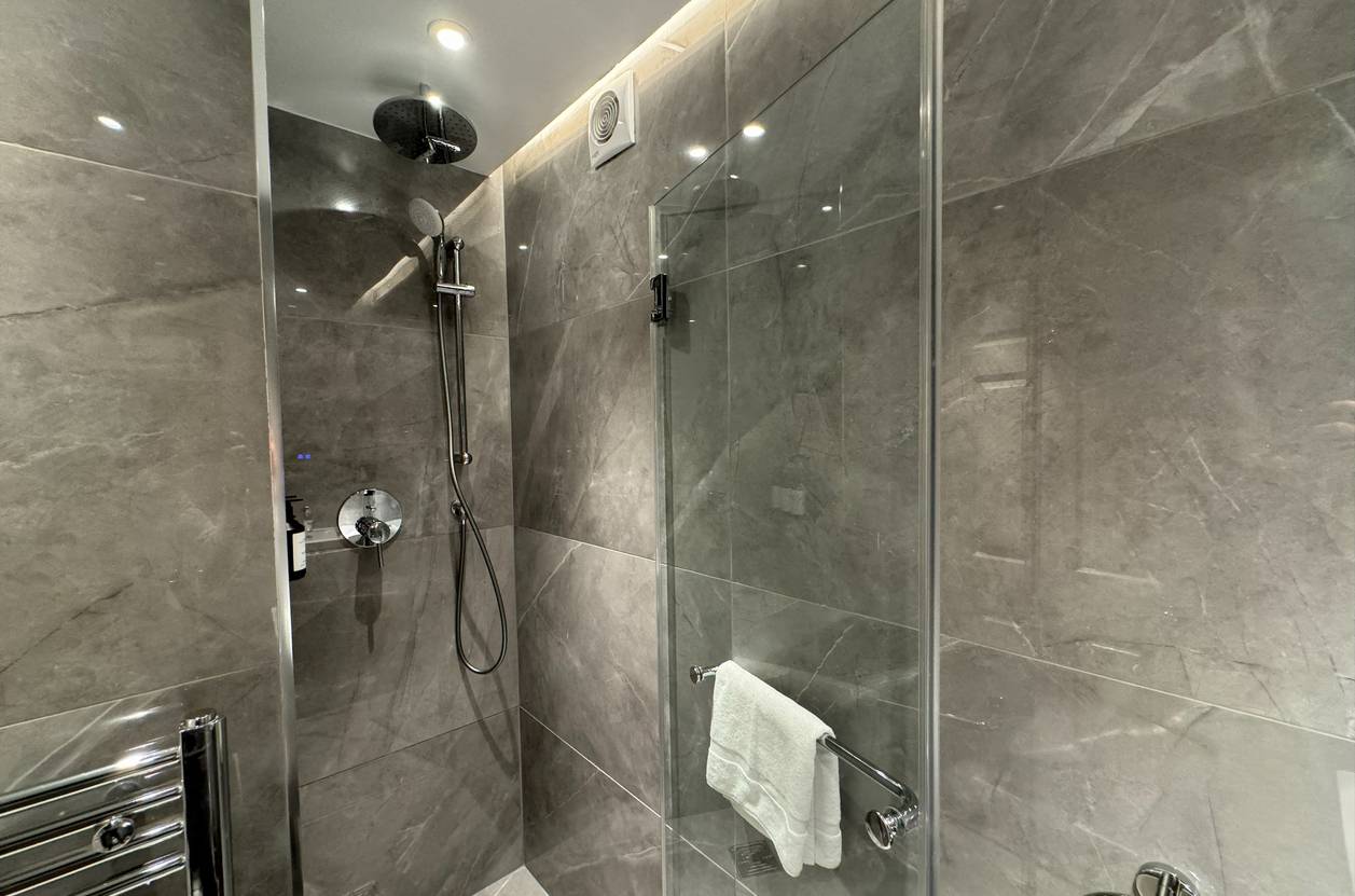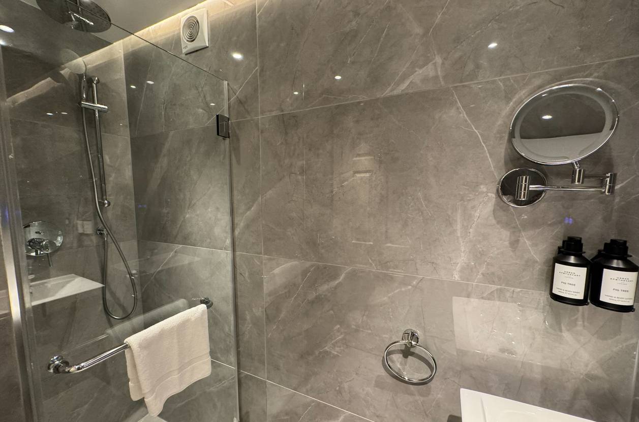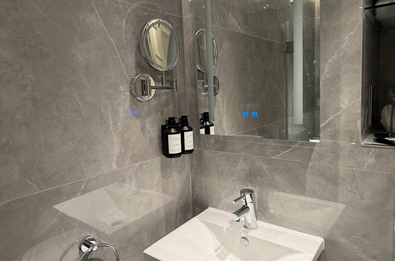 Each room features a small double bed (120cm), a private en-suite bathroom with underfloor heating, and modern enhancements including a brand-new air conditioning system, sustainable guest room management, enhanced lighting control, and a flat screen TV with Chromecast.